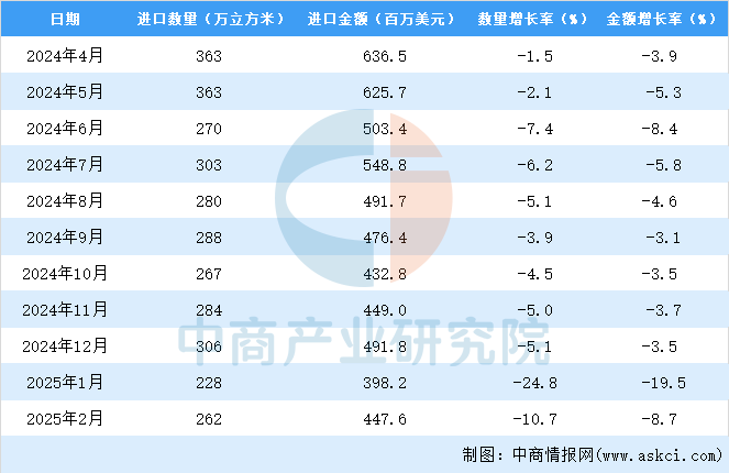 从金额方面来看,数据显示,2025年1-2月中国原木进口金额845。9百万美元,同比下降8。7%。